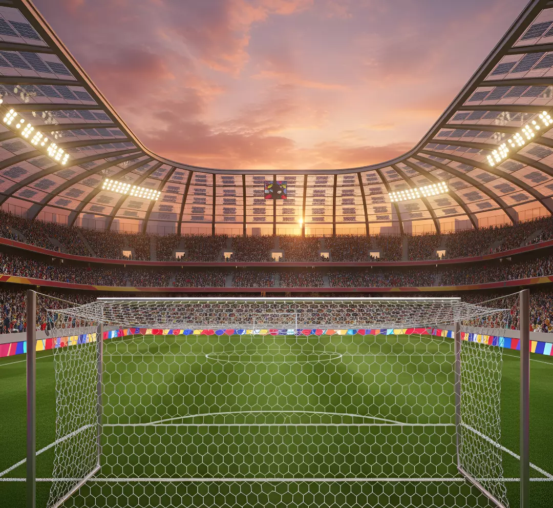 This image presents a magnificent view from behind a football goal, looking out onto a vast stadium bathed in the warm, dramatic light of a sunset. The sky above the open roof is painted with vivid orange and pink hues, contrasting beautifully with the bright stadium lights illuminating the field. The stands are filled with a cheering crowd, creating an atmosphere of excitement and anticipation. The lush green pitch and the intricate hexagonal netting of the goal are sharply in focus, inviting viewers to imagine the thrill of the game.