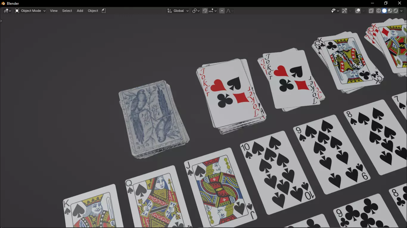 Hunter (parrot) 18s custom poker deck - Poker Card Set - High Detailed 3D model..The Files contain Full playing cards decks..Perfect for VFX & CGI & VR editing and modeling..High-made model created using Blender 3D software using Cycles render engine..Very high resolution textures..Every card has it's own texture (number card) and there are two textures for the back side of the cards..The Faces : 18920 , The vertices : 24640 ... The numbers may vary from software to another.you can get the 3d model as: .blend - .3ds - .max - .dwg - .dxf - .dae - .abc - .usdc - .ply - .obj, .mtl - .stl - .fbx - .gltf, .glb and ofcourse textures in a .rar file as .jpg & .png increase your work to another level and buy the Hunter (parrot) 18s custom Deck Pocker set NOW! FOLLOW FOR MORE! and don't forget to give your opinion belowv