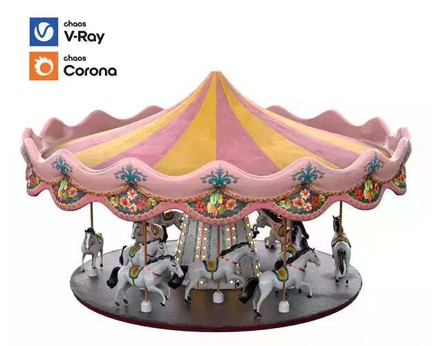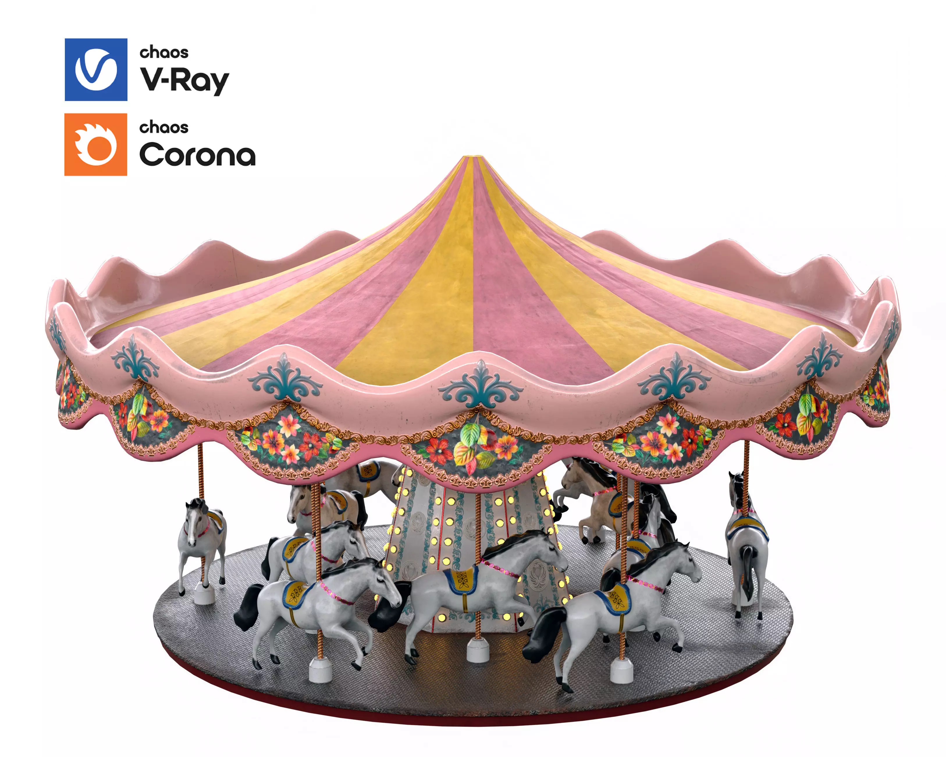 This merry-go-round carousel model showcases a beautifully detailed design, including carved horses, ornate decorations, and realistic lighting fixtures. The high-quality textures and materials are pre-configured to ensure a professional look, while the geometry is optimized for maximum efficiency and performance.