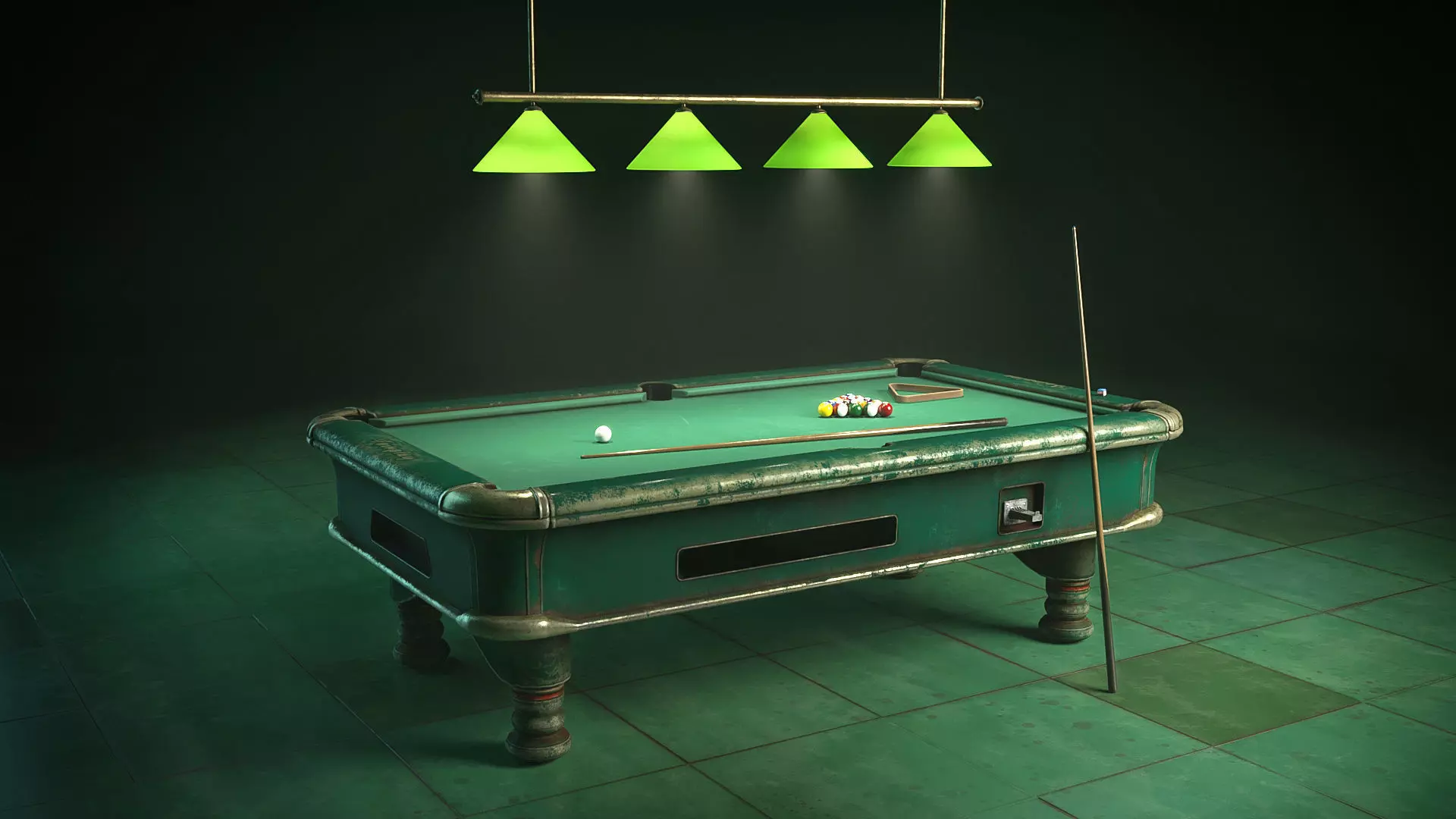 Metallic Pool table low poly version to use in any project which is important the deatail and low polygons. The previews have been rendered in V-Ray (next) for 3ds max and blender (see the reference images). The 3d project contains 4 separated assets: -pool table (11974 polys),- balls, triangle, cues and chalk (6648 polys), -lamp (3454 polys)and -floor tileable (1 poly). Each assets is unwrapped not overlaping, named with its respective materials applied with real measures and centered in zero coordinates. It is included a vray 3ds max file in dark atmosphere, 1 vray 3ds max in white background, a obj with mtl file, a fbx and blender file with its own materials applied. It is provided with vray materials applied with PBR textures (color, roughness, ambient occlusion, normal map, emissive and metallic), blender material aplied. It is ready to use in broadcast, advertising, design visualization, real-time, video game etc...