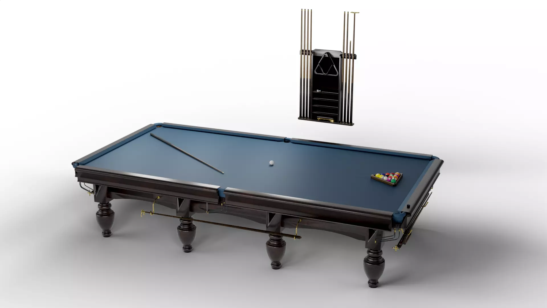 Complete billiard accessory set: cue sticks, cue rack, white cue ball, full numbered ball set, rack triangle