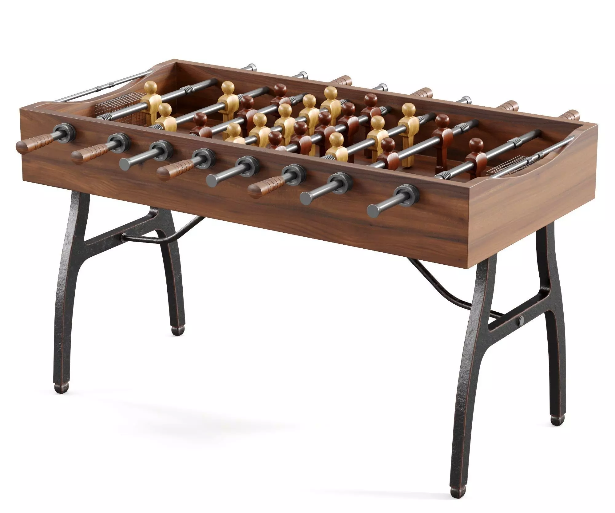 3D model of a custom made foosball table, in wood and steel material, with rusty wrought iron legs; designed by Restoration Hardware. The model is based on the manufacturer's original dimensions.Mesh is mainly based on quads, smooth and clean. *TURBOSMOOTH IS ENABLED IN RENDER MORE to save memory on polycount and for viewport optimization.