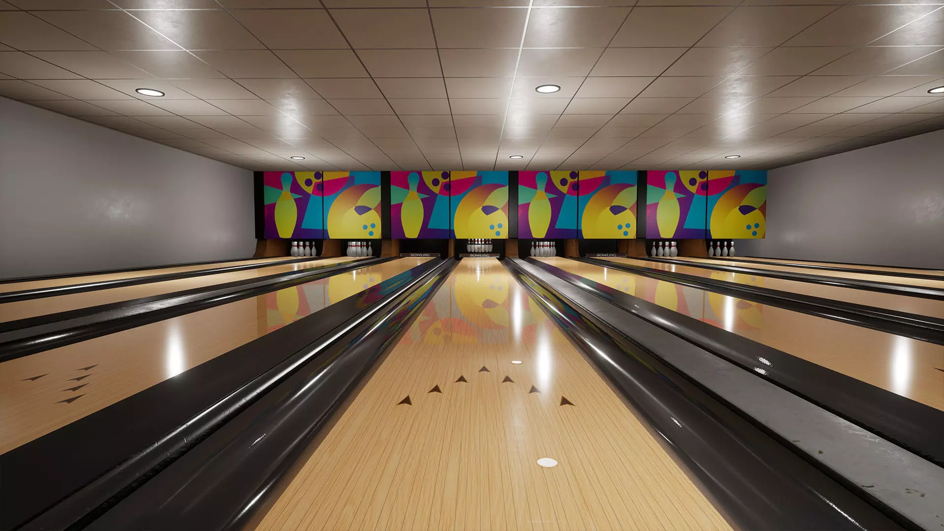For Bowling contains Balls, Bowling Bar, Chairs in two type, Computer, Bowling line, Bowling line poster, Return Machine, Skittle with old and new texture, Skittle Machine and TV for points.