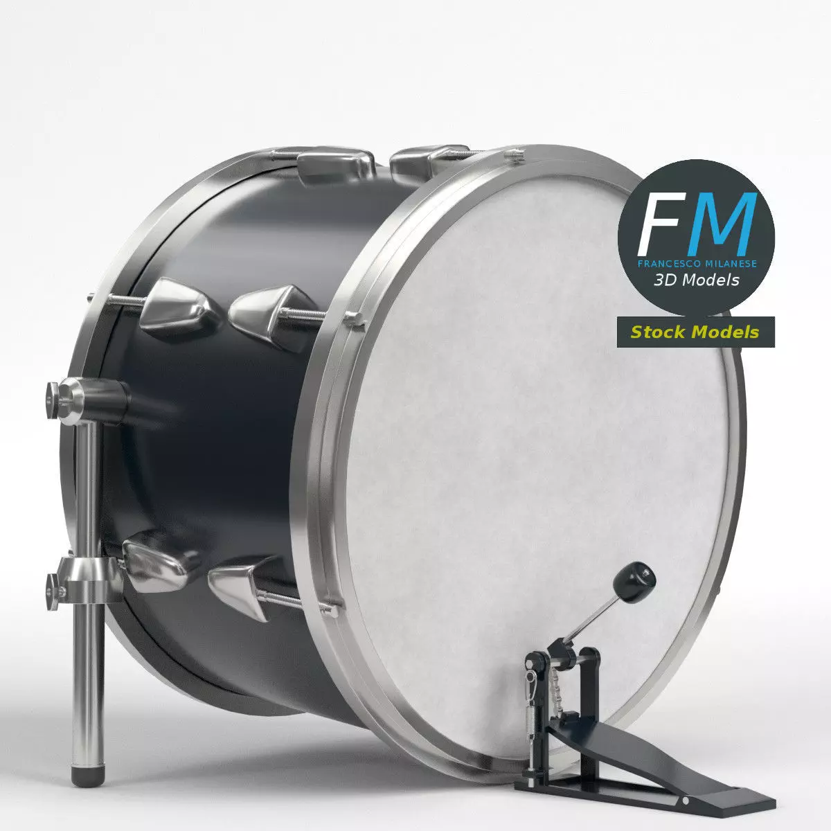 Bass drum with pedal 3D Model. 2 individual objects (bass drum, pedal) sharing the same non overlapping UV Layout map, Material and PBR Textures set. Production-ready 3D Model, with PBR materials, textures, non overlapping UV Layout map provided in the package.Quads only geometries (no tris/ngons).Easily customizable: UV unwrapped geometries; UV Layout maps provided in the package as png with alpha images.Each Object, Material or Texture provided in the package has a unique, meaningful name.Made in Blender 3.3 with Cycles Principled BSDF PBR shader with textures included (Eevee compatible), then exported to OBJ and FBX (with embedded PBR Textures); materials and textures made in Substance Painter, exported for PBR, Cycles, V-Ray, Unity, Unreal.PROMO IMAGES: the first image has been rendered in Cycles for Blender; in particular, you can find 11+ promo images in this description: