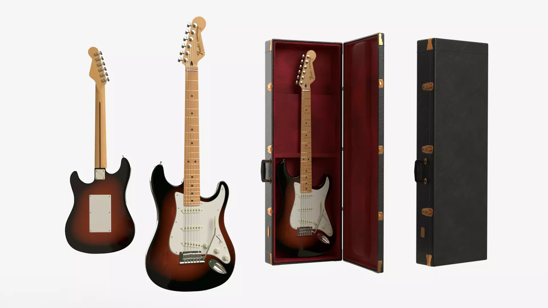Electric Guitar Fender Stratocaster with Case the model features clean geometry (no N-gons) , unwrapped UV maps,high-resolution 2K and 4K PBR textures.