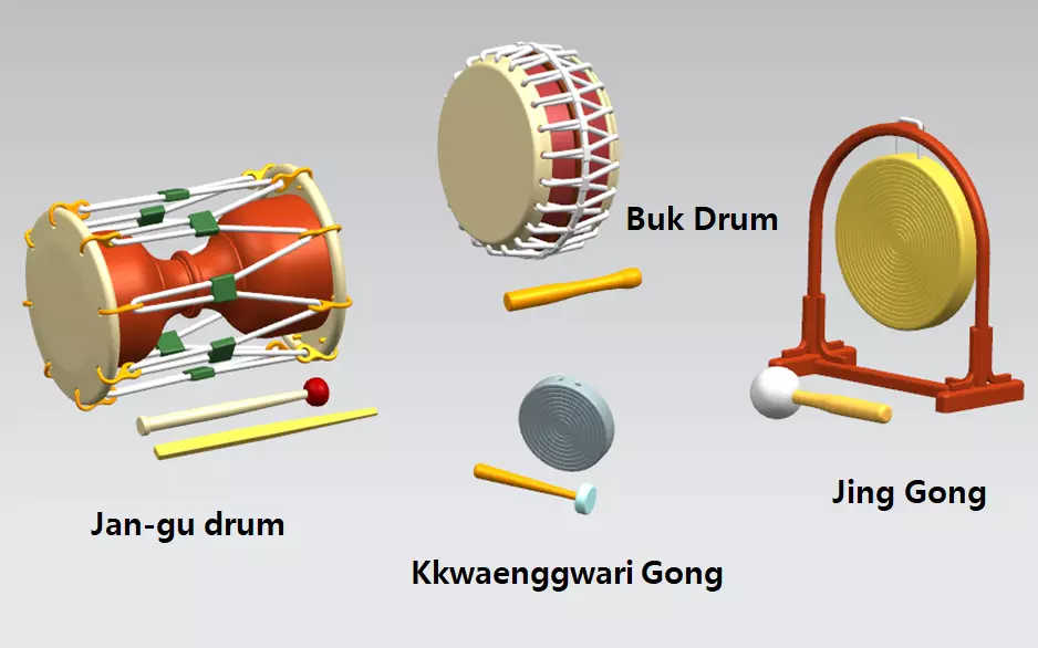 Musical instruments for Sa-mul-no-ri4 basic instruments for Samulnori : ‘Jang-gu drum’, ‘Buk drum’, ‘Jing gong’and “Kkwaenggwari Gong’