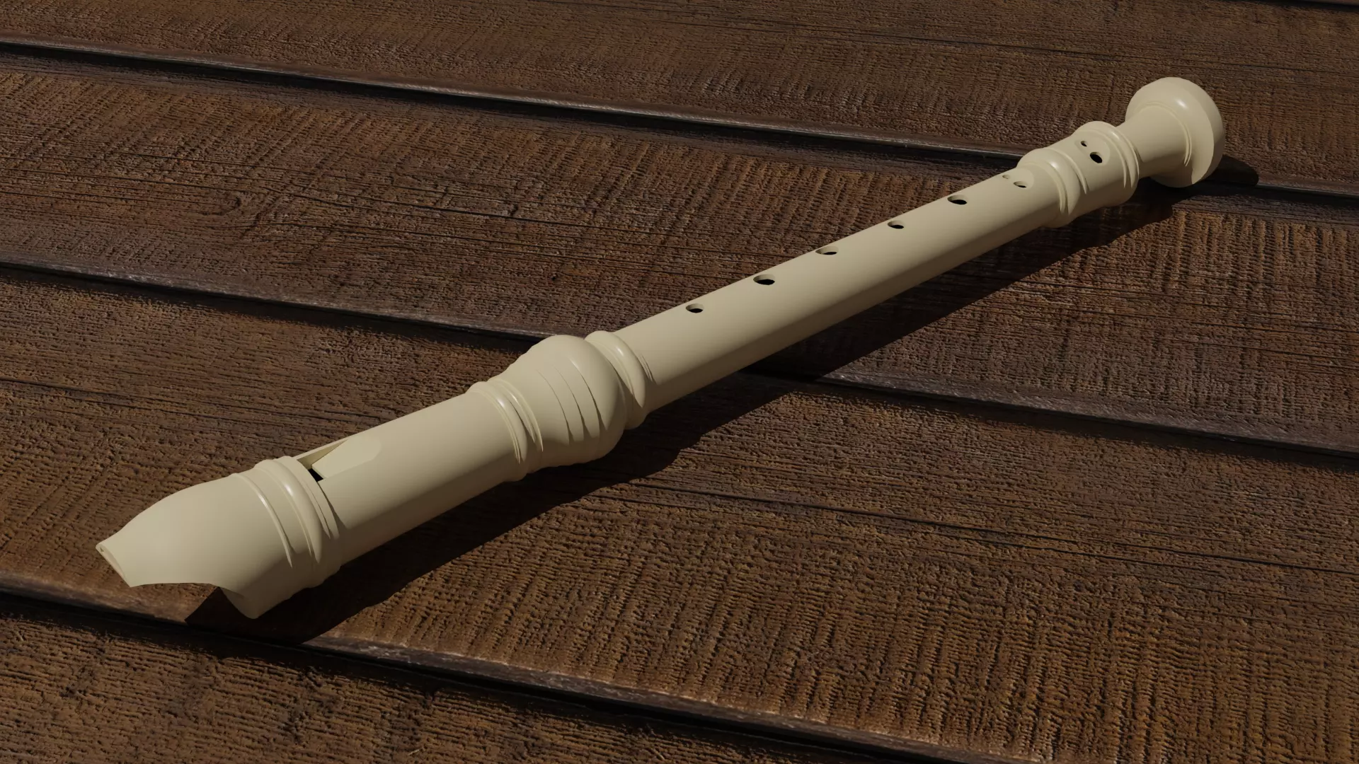 A detailed soprano recorder in an off-white color modeled in a popular style, with accurate mouthpiece, holes, doubleholes, and window. Modelled to scale, measuring 32.7 cm in length. Inside of the recorder is not modelled. Camera, lights, and background not included in sold product.
