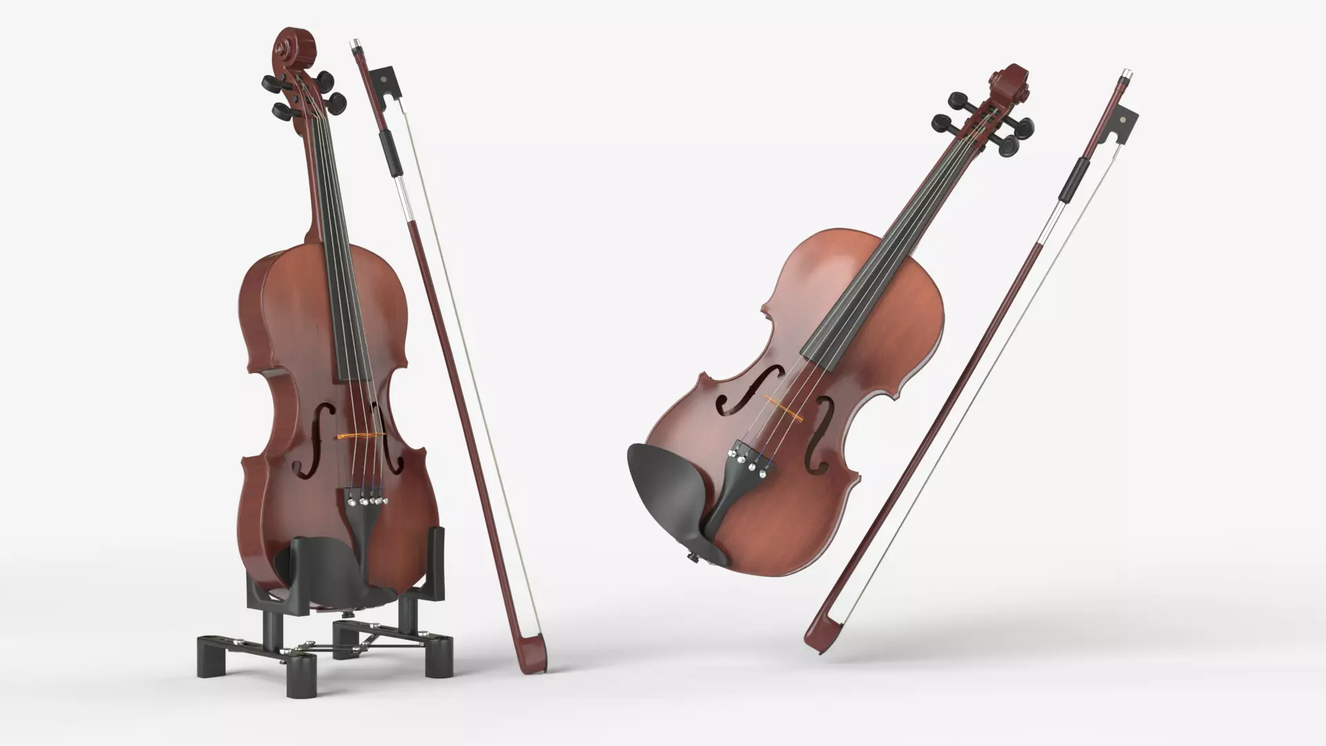 Violin music instrument with Bow and stand. the model features clean geometry (no N-gons) , unwrapped UV maps,high-resolution 2K and 4K PBR textures.
