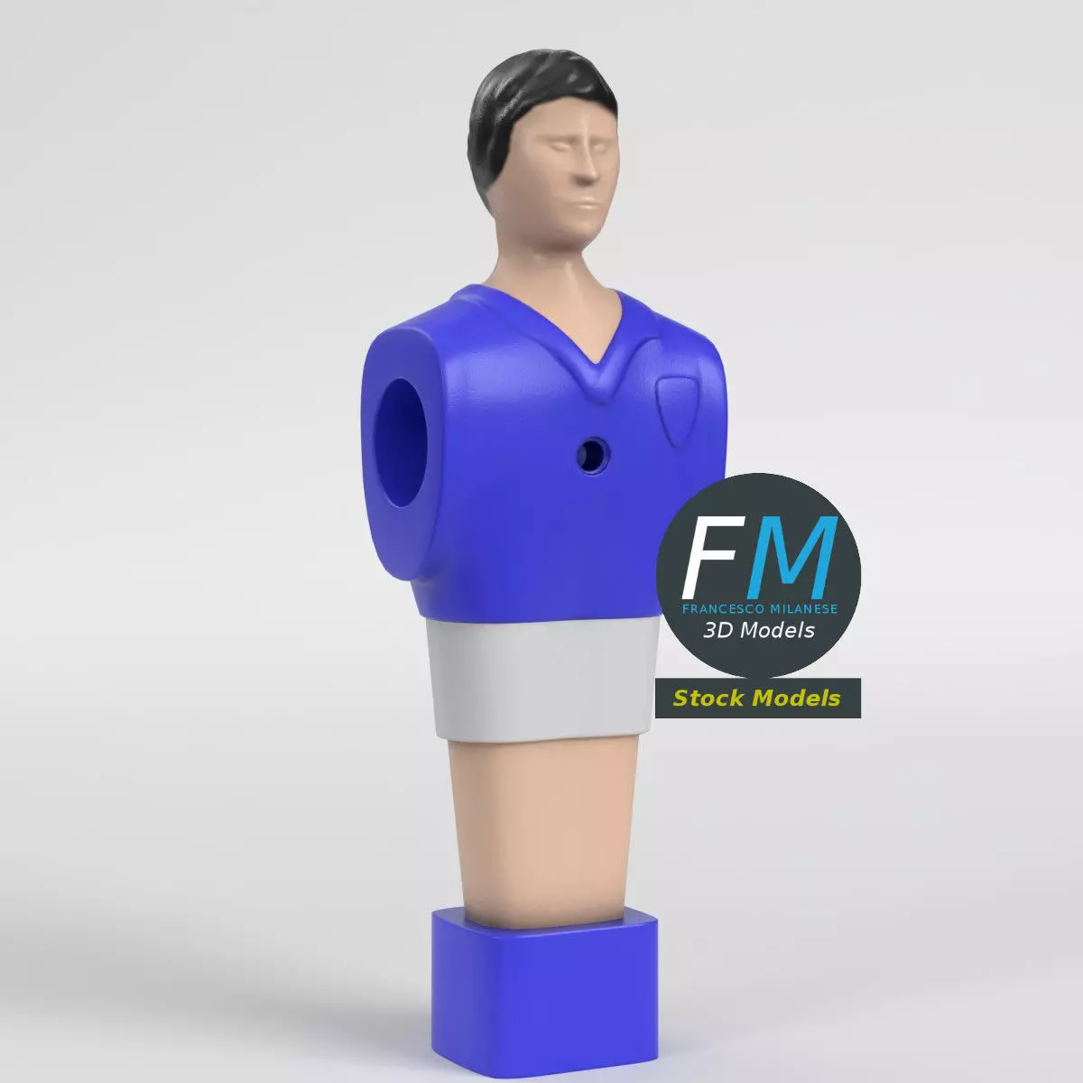 High poly foosball figurine 3D Model. Production-ready 3D Model with non overlapping UV Layout map provided in the package. PBR Materials and Textures (Metallic Workflow: Base Color, Metallic, Roughness, Normal) embedded in the Blend, FBX, and GLB files.Easily customizable: UV unwrapped geometries; UV Layout maps provided in the package as png with alpha images.Quads-only geometry.Made with Blender 4.5 LTS with Cycles Principled BSDF (PBR, Metallic Workflow) Material, then exported to other formats (OBJ, FBX, GLB; FBX and GLB have embedded textures).Promo images: some renderings made with Cycles for Blender, plus Wireframes and Blender screenshots (Object Mode, Edit Mode with UVs).Formats included: FBX with embedded PBR Textures (Metallic Workflow: Base Color, Metallic, Roughness, Normal), GLB with embedded PBR Textures (Metallic Workflow: Base Color, Metallic, Roughness, Normal), OBJ; scenes: BLEND (with Cycles Principled (PBR) Materials); other: 16-bit PNGs with Alpha.1 Object (mesh), 1 PBR Material, UV unwrapped (non overlapping UV Layout map provided in the package).UV Layout maps and Image Textures resolutions: 2048x2048.Polygonal, QUADS-ONLY, 19953 vertices, 19957 quad faces (39914 tris).Real world dimensions; scene scale units: METERS in Blender 4.5 LTS (that is: Metric with 1.00 scale).Uniform scale object (scale applied in Blender 4.5 LTS).PBR Textues included: in a zipped folder, you'll find the PBR Textures set (as 16-bit PNGs with Alpha).IMPORTANT --- Main renderings made with Blender 4.5 LTS + Cycles using an HDR Environment Texture Image which is NOT provided in the package!
