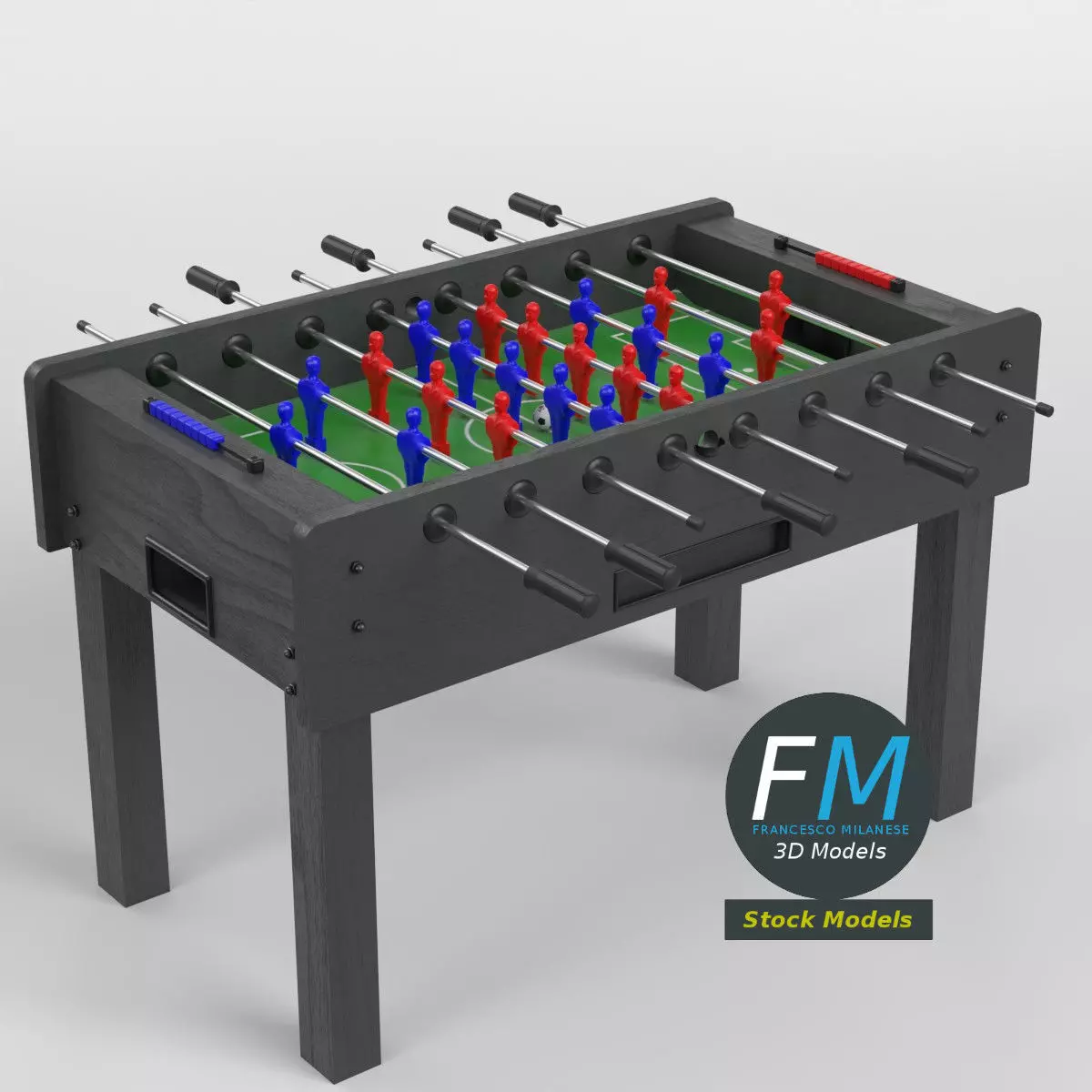 Foosball table football 3D Model, nr. 1 in my collection, home version (no coin acceptor). 28 objects (1 cabinet, 1 ball, 8 rods, 18 score beads; you can easily rotate the rods or move the ball or the beads), sharing 6 Materials (beads, cabinet, field and ball, rods, team 1 figurines, team 2 figurines) with PBR Textures sets and non overlapping UV Layouts. Production-ready 3D Model with non overlapping UV Layout map provided in the package. PBR Materials and Textures (Metallic Workflow: Base Color, Metallic, Roughness, Normal) embedded in the Blend, FBX, and GLB files.Easily customizable: UV unwrapped geometries; UV Layout maps provided in the package as png with alpha images.Quads-only geometry.Made with Blender 4.5 LTS with Cycles Principled BSDF (PBR, Metallic Workflow) Material, then exported to other formats (OBJ, FBX, GLB; FBX and GLB have embedded textures).Promo images: some renderings made with Cycles for Blender, plus Wireframes and Blender screenshots (Object Mode, Edit Mode with UVs).Formats included: FBX with embedded PBR Textures (Metallic Workflow: Base Color, Metallic, Roughness, Normal), GLB with embedded PBR Textures (Metallic Workflow: Base Color, Metallic, Roughness, Normal), OBJ; scenes: BLEND (with Cycles Principled (PBR) Materials); other: 16-bit PNGs with Alpha.28 Objects (meshes), 6 PBR Materials, UV unwrapped (non overlapping UV Layout map provided in the package).UV Layout maps and Image Textures resolutions: 2048x2048.Polygonal, QUADS-ONLY, 91976 vertices, 91204 quad faces (182408 tris).Real world dimensions; scene scale units: METERS in Blender 4.5 LTS (that is: Metric with 1.00 scale).Uniform scale object (scale applied in Blender 4.5 LTS).PBR Textues included: in a zipped folder, you'll find the PBR Textures set (as 16-bit PNGs with Alpha).IMPORTANT --- Main renderings made with Blender 4.5 LTS + Cycles using an HDR Environment Texture Image which is NOT provided in the package!