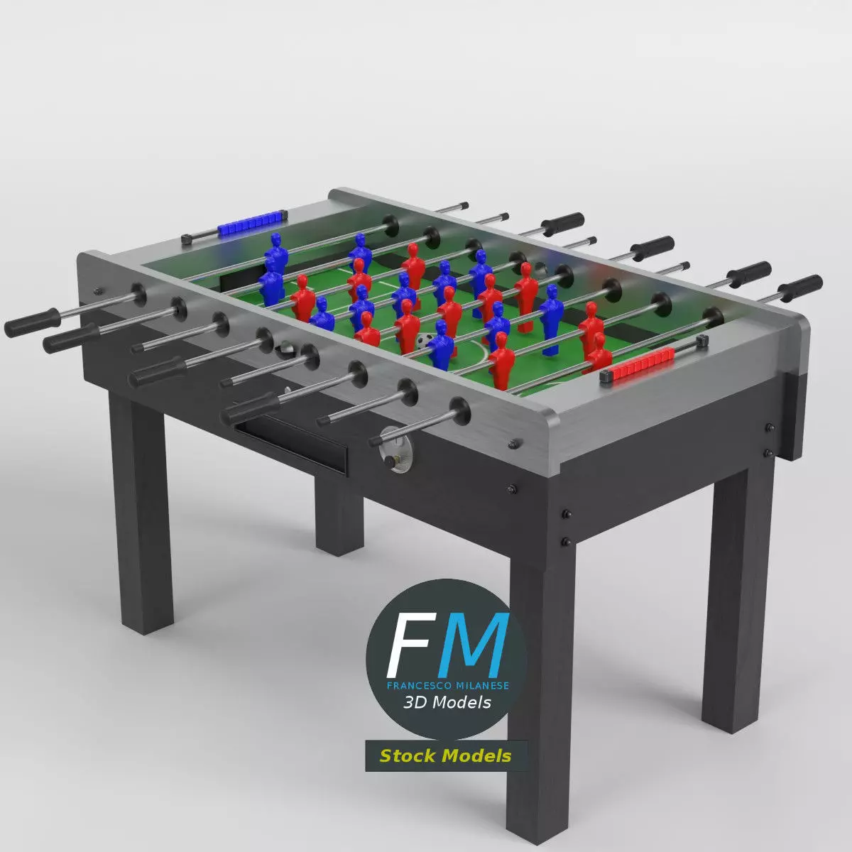 Foosball table football 3D Model, nr. 2 in my collection, coin acceptor version (for bars, clubs, pubs, ...). 29 objects (1 cabinet, 1 ball, 1 coin acceptor lever, 8 rods, 18 score beads; you can easily rotate the rods or move the ball, the coin acceptor lever, or the beads), sharing 3 Materials (cabinet; figurines; field and ball) with PBR Textures sets and non overlapping UV Layouts. Production-ready 3D Model with non overlapping UV Layout map provided in the package. PBR Materials and Textures (Metallic Workflow: Base Color, Metallic, Roughness, Normal) embedded in the Blend, FBX, and GLB files.Easily customizable: UV unwrapped geometries; UV Layout maps provided in the package as png with alpha images.Quads-only geometry.Made with Blender 4.5 LTS with Cycles Principled BSDF (PBR, Metallic Workflow) Material, then exported to other formats (OBJ, FBX, GLB; FBX and GLB have embedded textures).Promo images: some renderings made with Cycles for Blender, plus Wireframes and Blender screenshots (Object Mode, Edit Mode with UVs).Formats included: FBX with embedded PBR Textures (Metallic Workflow: Base Color, Metallic, Roughness, Normal), GLB with embedded PBR Textures (Metallic Workflow: Base Color, Metallic, Roughness, Normal), OBJ; scenes: BLEND (with Cycles Principled (PBR) Materials); other: 16-bit PNGs with Alpha.29 Objects (meshes), 3 PBR Materials, UV unwrapped (non overlapping UV Layout map provided in the package).UV Layout maps and Image Textures resolutions: 2048x2048.Polygonal, QUADS-ONLY, 96094 vertices, 93970 quad faces (187940 tris).Real world dimensions; scene scale units: METERS in Blender 4.5 LTS (that is: Metric with 1.00 scale).Uniform scale object (scale applied in Blender 4.5 LTS).PBR Textues included: in a zipped folder, you'll find the PBR Textures set (as 16-bit PNGs with Alpha).IMPORTANT --- Main renderings made with Blender 4.5 LTS + Cycles using an HDR Environment Texture Image which is NOT provided in the package!