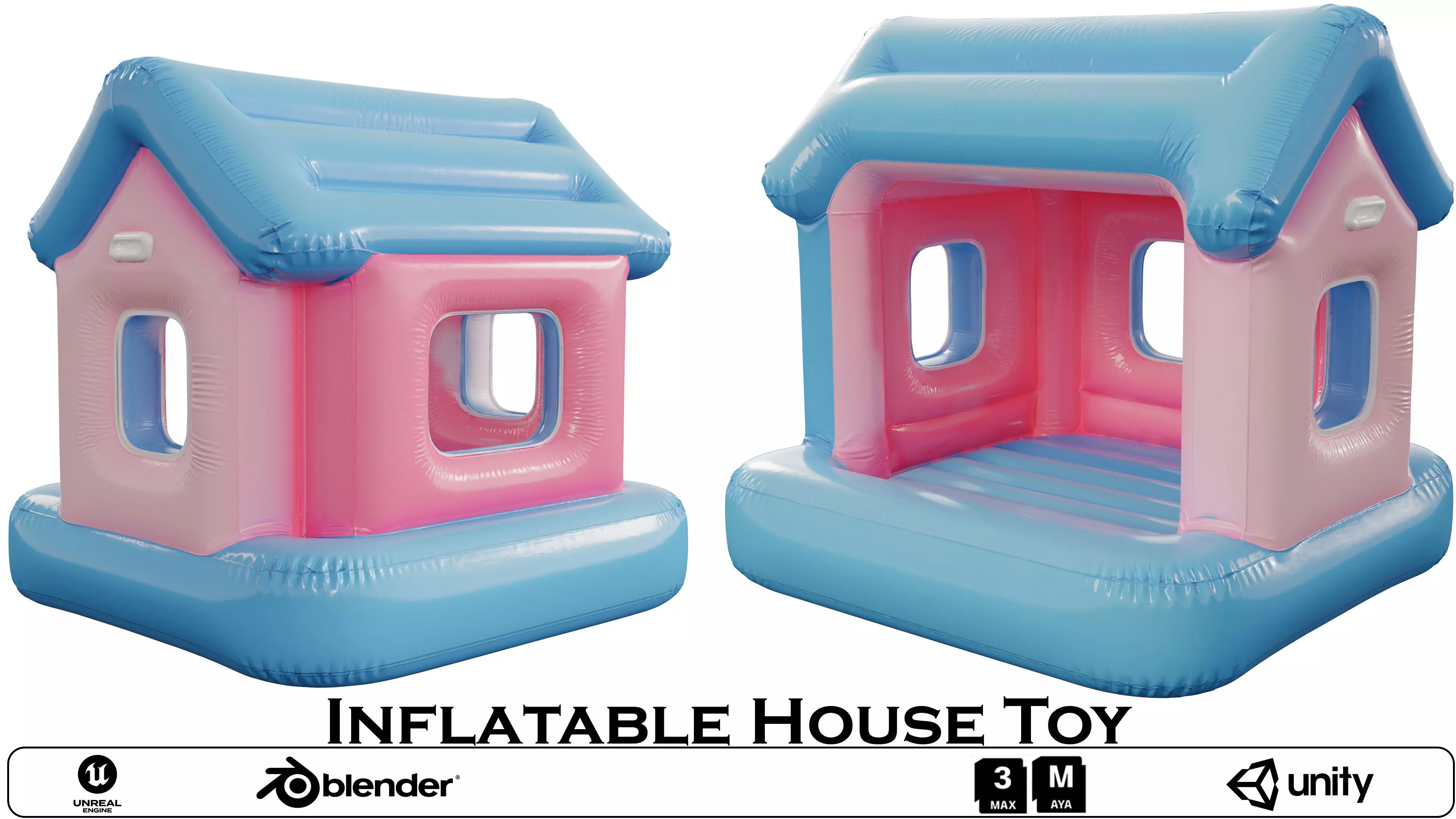 Name: Inflatable House ToyType: modelFormat: 3Ds Max 2013Export: FBX, OBJRender: VRay (5.x), Corona (6)Polys: 56419Verts: 56481Matclasses: VRayMtl,CoronaMtlUnits: CentimetersDimension: 80.26 x 75.03 x 74.3Date: 2026.2.22Add playful, colorful charm to your digital environments with this Inflatable House Toy 3D model. Designed with a glossy vinyl‑like finish, the model features a blue roof, pink walls, open windows, and an accessible interior—perfect for pool‑themed scenes, children’s games, stylized worlds, and AR/VR experiences. The soft, rounded shapes and bright colors make it ideal for any project needing a fun inflatable prop.