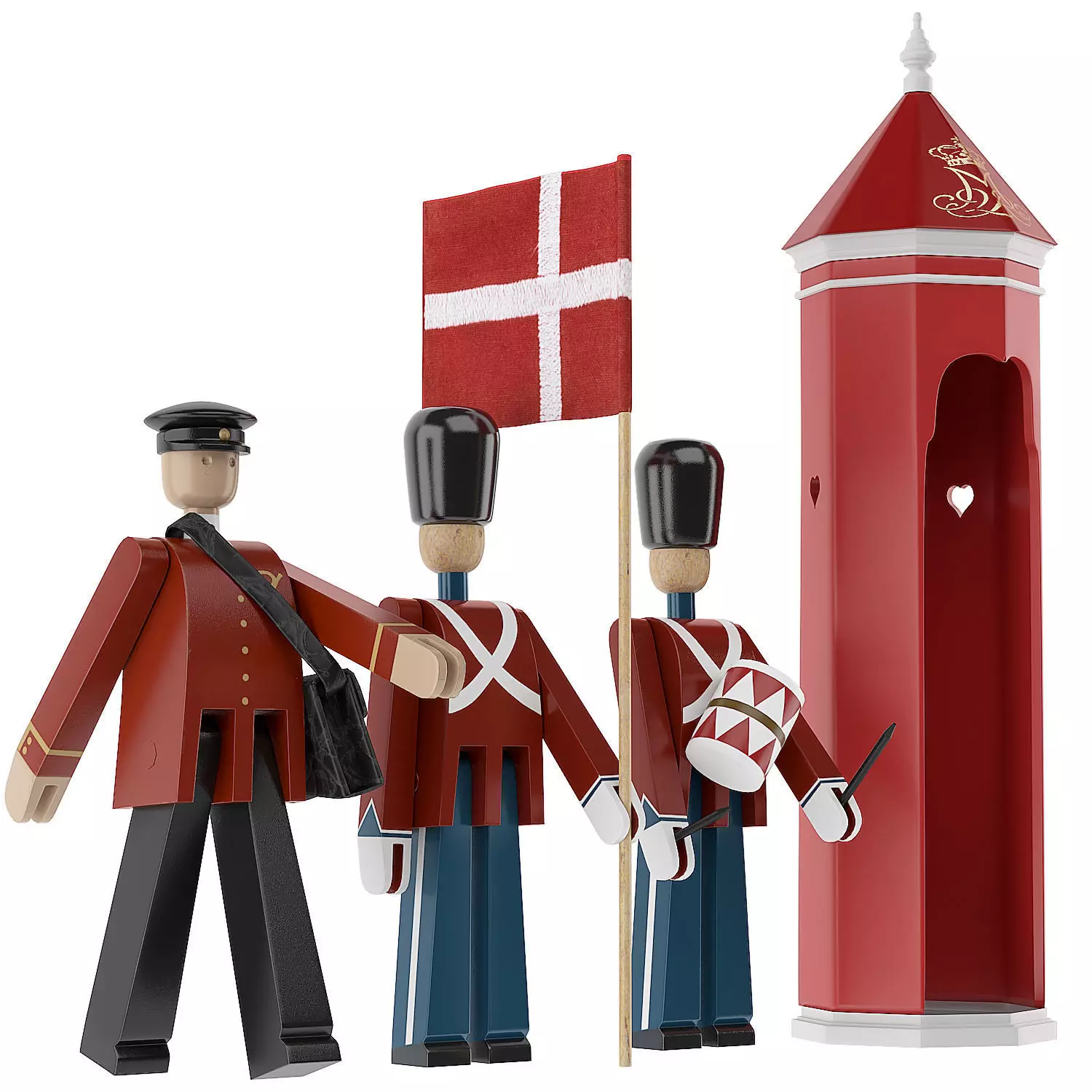 High quality 3d models set of 5 Scandinavian danish design of Kay Bojesen toys figures. This collection contains brevbærer einar, fanebærer med flagg, trommeslager, vaktskur og flagg. Its all trendy expensive danish toys accessory decor that fits every modern homes. Collection comes with all maps included and are ready to render as you see it. The only thing that is done with the preview images is adjusted sharpness in photoshop, else is what you see is what you get.Now includes Corona as well as V-RayThese are made originally in 3dsmax 2020 and V-Ray Next. They are tested for 3dsmax 2017 and for V-Ray render 3.4 with the excact same result.