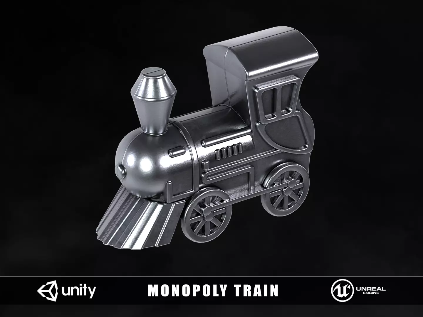 Monopoly Train 3D model. This model comes with the Monopoly Piece and 1 texture set. Modeled in Maya and textured with Substance Painter and Photoshop. The model is built to scale and is UV unwrapped with 4k textures. Includes 3D model and textures!
