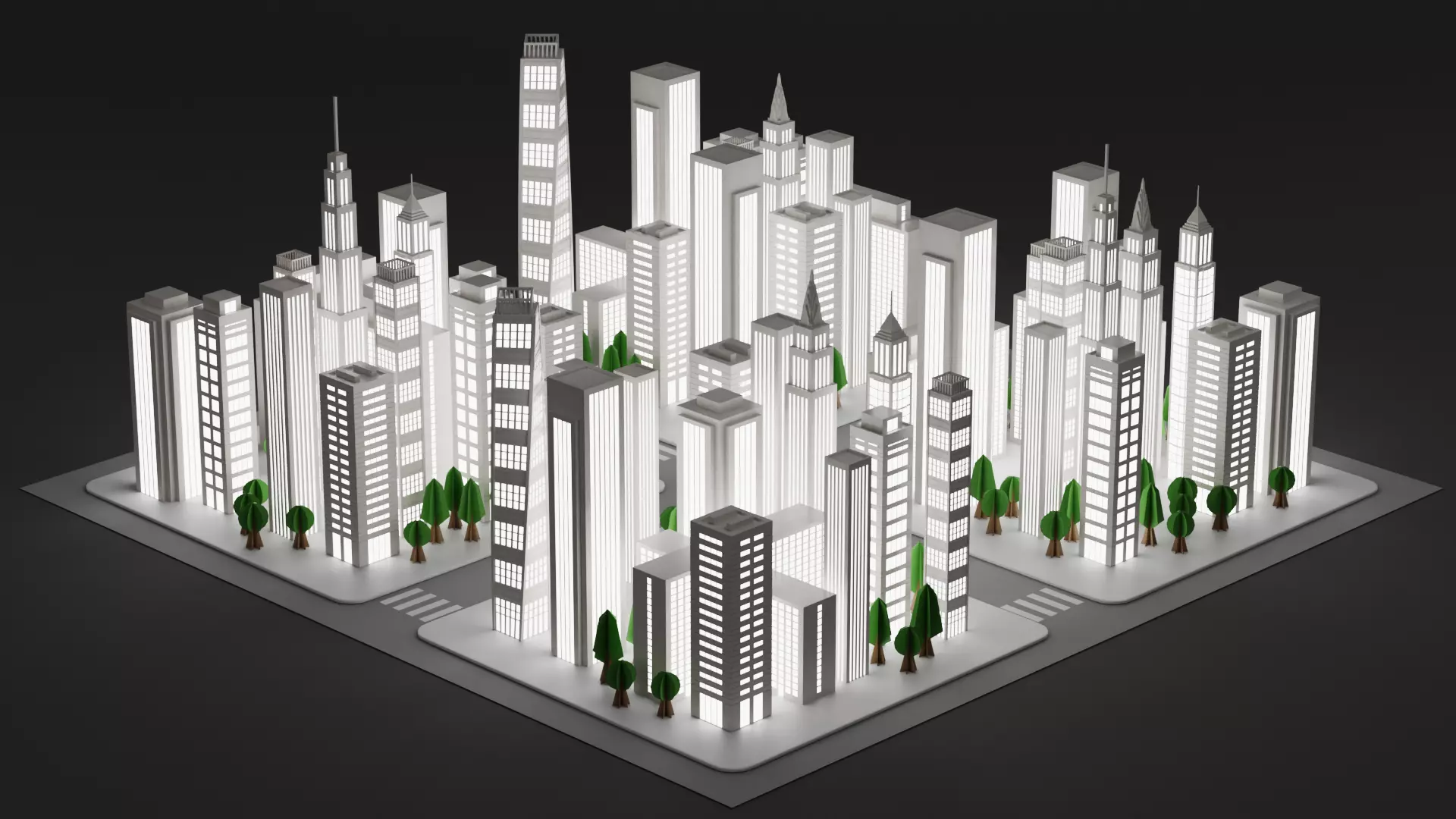 A night version of paper city featuring high-rise buildings arranged into urban blocks, complete with streets and a trees. This 3D scene captures the essence of a miniature metropolis block built entirely from paper - designed as a modular city environment, it can serve as a standalone visual piece or the foundation for larger stylized worlds.