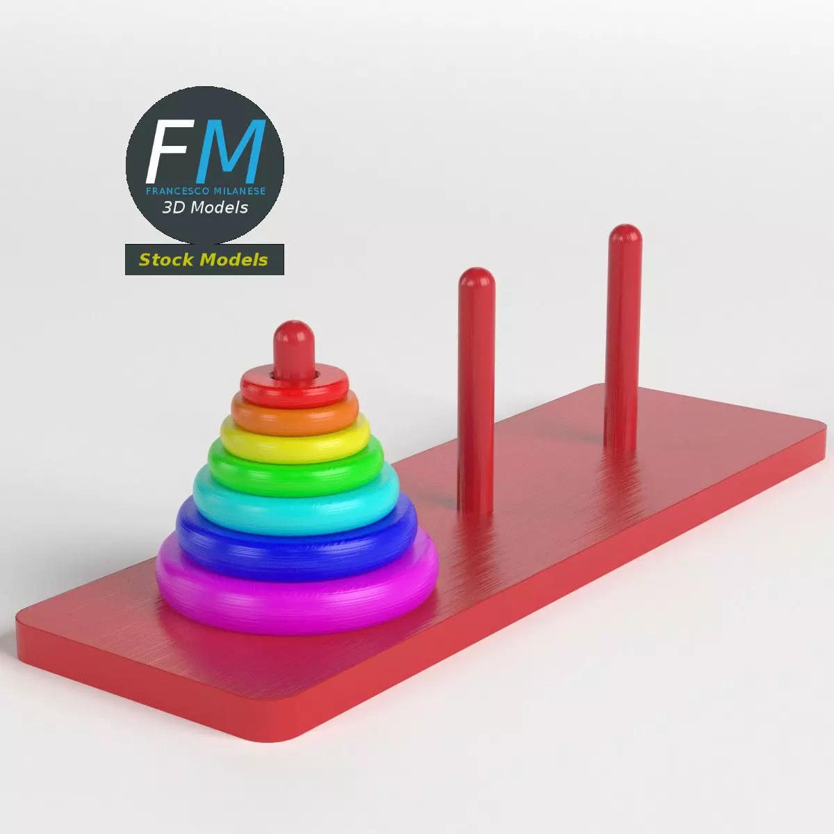 Tower of Hanoi game kit 3D Model. 8 individual objects (a base and seven discs), sharing the same non overlapping UV Layout map, Material and PBR Textures set. Production-ready 3D Model, with PBR materials, textures, non overlapping UV Layout map provided in the package.