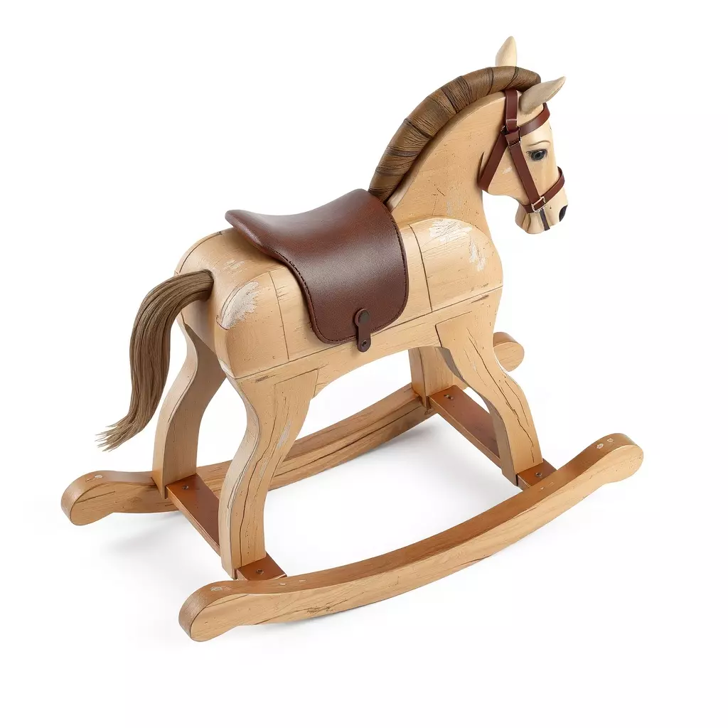 This meticulously crafted 3D model represents a charming vintage wooden rocking horse, perfect for adding a touch of nostalgic whimsy to any digital scene. The model features a distressed wood texture with subtle paint chips, replicating the authentic look of a beloved antique toy. It comes complete with a finely detailed brown leather saddle and bridle, adding to its realistic appeal. This asset is ideal for a wide range of creative applications, including architectural visualization for nurseries, children's rooms, or cozy living spaces, as well as period-themed interior renderings. Game developers can utilize it as a unique prop in adventure games, simulation environments, or interactive AR/VR experiences, enriching virtual worlds with character. Digital artists and animators will find it a valuable addition for creating captivating still renders or dynamic scenes. The model boasts clean topology, ensuring smooth deformations if rigged for animation, and is fully UV unwrapped for easy texture customization. It includes high-quality PBR textures for realistic material representation across various rendering engines. Supported file formats typically include GLB, OBJ, FBX, and USD, making it highly compatible with most 3D software workflows. While highly detailed, it is optimized to maintain efficiency for both real-time applications and high-resolution static renderings, offering versatility without compromising visual fidelity.