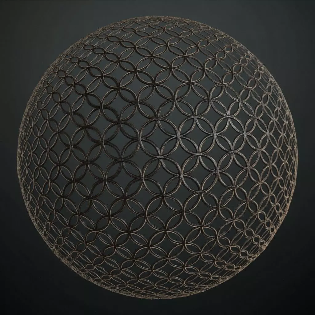 This is a PBR Texture Pack of Aesthetic Overlapping Circle Iron Guard. All the maps such as BaseColor, Normal, Roughness, Height, Metallic, and Opacity are provided as per requirement.