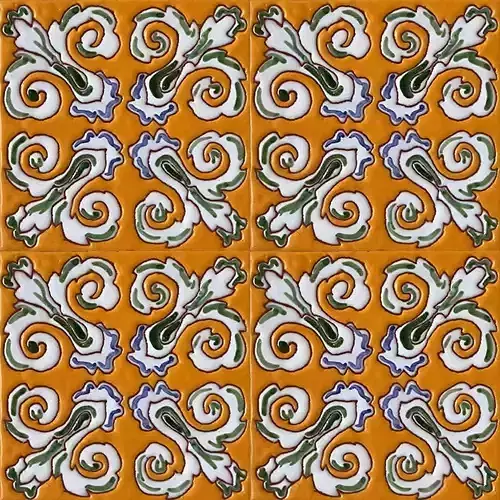 What’s includedSeamless Talavera inspired pattern featuring white baroque scrolls with green and blue accents on a warm amber glaze, with glossy relief and crisp grout.