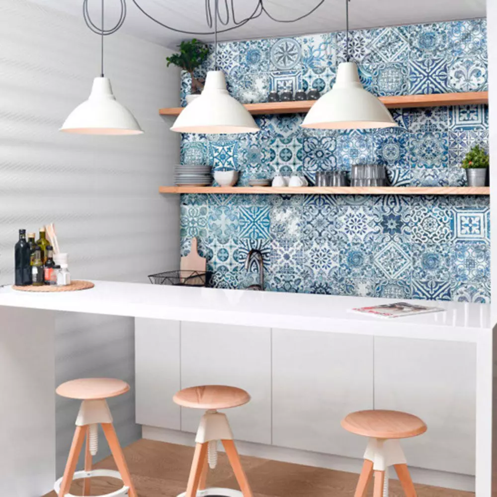 A bright collage of hand‑painted azulejo motifs in layered cobalt, sky, and white turns backsplashes into a coastal statement without grout or ceramic install costs, perfect for modern kitchens and café bars. Intricate rosettes, scrolls, and floral medallions carry subtle crackle and patina for an authentically aged look while remaining clean and crisp at large scales. The design repeats seamlessly for long runs and full‑height features, and the lifestyle preview shows accurate proportioning with open shelves, pendants, and a minimalist counter layout .