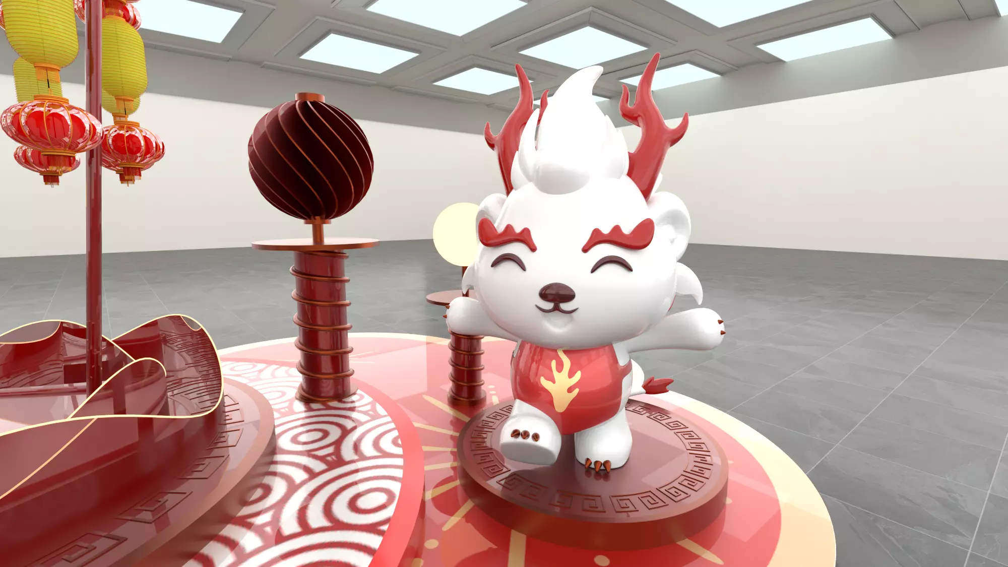 Thiết kế trong hình mang đậm dấu ấn của Tết Nguyên Đán và tinh thần năm Thìn, kết hợp hài hòa giữa tính truyền thống và hơi thở hiện đại. Trung tâm là mô hình vòng xoay trang trí với sắc đỏ – vàng chủ đạo, biểu tượng cho may mắn, thịnh vượng và hạnh phúc. Vòng tròn phía trên nổi bật dòng chữ “Happy Year of the Dragon”, khẳng định chủ đề năm Rồng đầy khí thế.