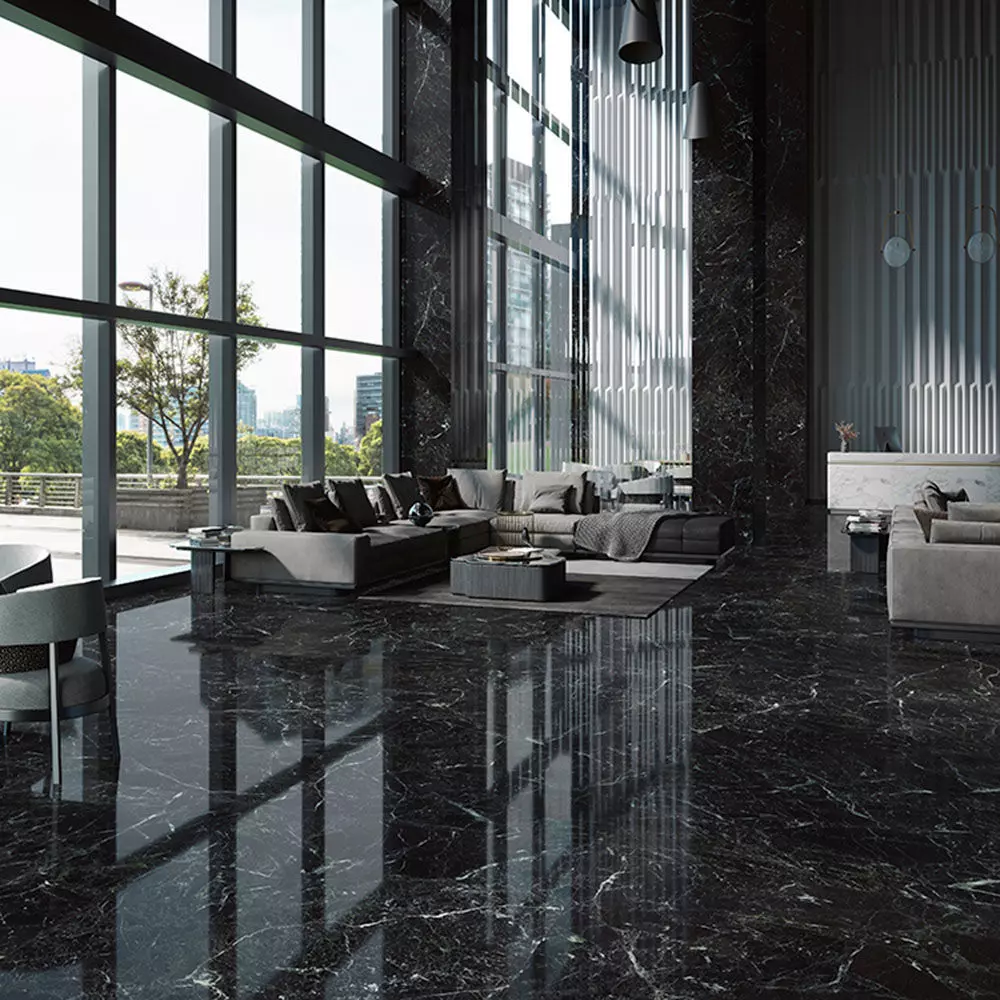 Preview images illustrate the deep black base, natural white veining, and high-gloss finish as applied in a modern luxury lobby.