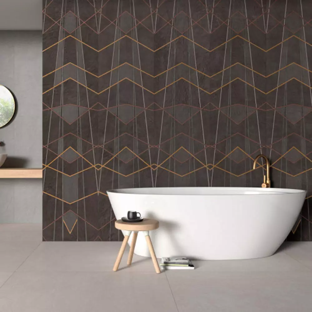 Look: Dark stone with brass/copper linear inlay in Deco chevrons