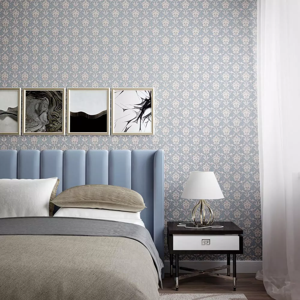 OverviewA timeless damask wallpaper texture in dusty blue with champagne scrollwork, delivering refined elegance for bedrooms, living rooms, boutique hotels, and formal dining spaces. The sculpted motifs feature fine ribbed highlights over a subtle woven ground, providing rich depth while remaining calm and versatile.