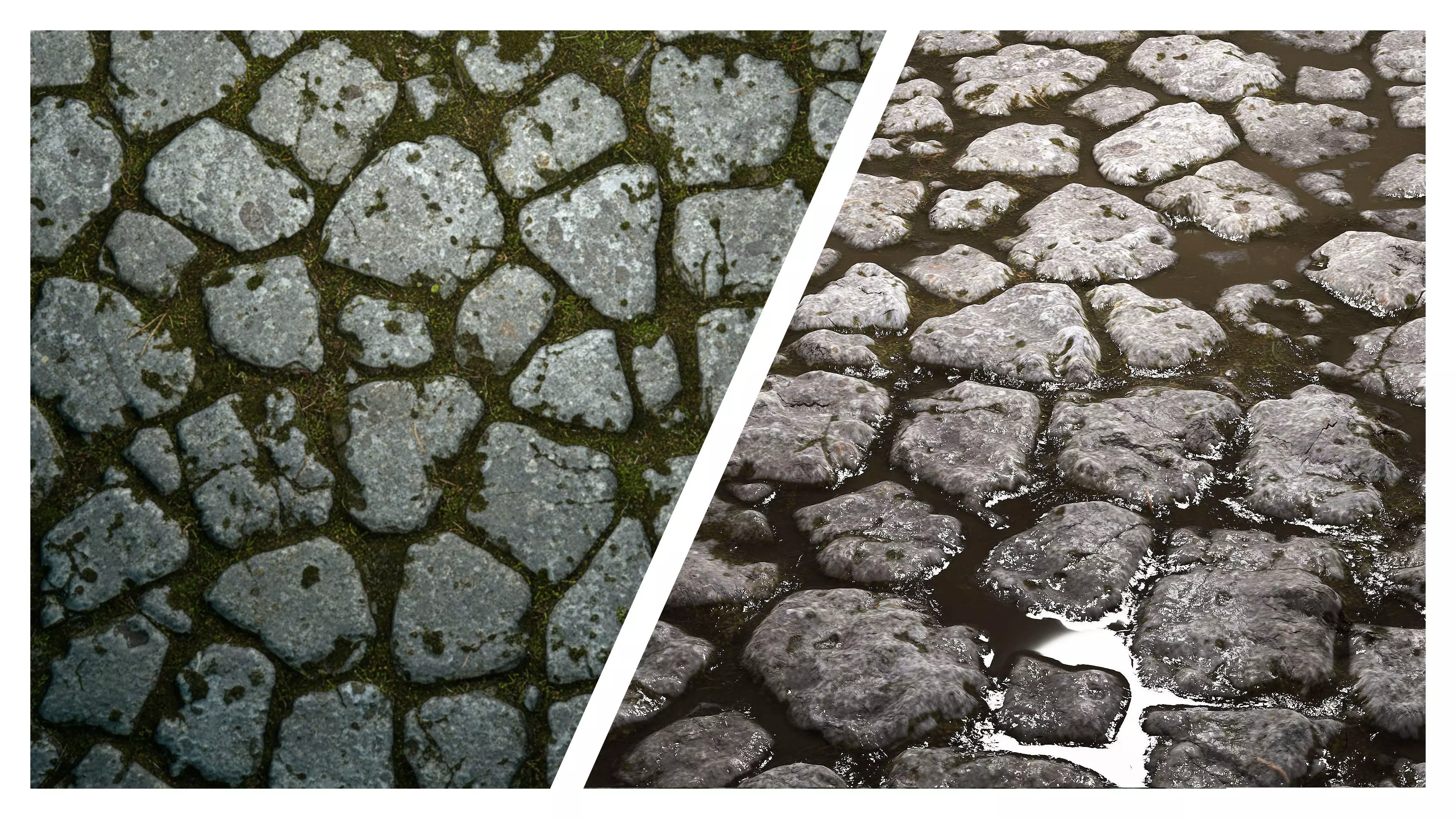 Both textures are fully PBR-ready and designed for accurate light interaction, showcasing natural stone variation, surface wear, moisture response, and organic moss growth. The wet cobblestone texture delivers realistic reflections and darker tonal depth, while the mossy version adds organic detail perfect for aged streets, courtyards, ruins, or outdoor scenes.