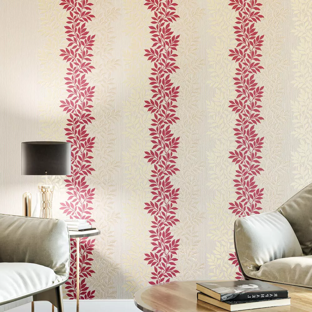 A lively wallpaper featuring vertical stripes of crimson laurel leaves over an ivory ground with subtle tonal foliage, designed as a seamless tile for bright living areas and hallways . The primary leaves have a suede‑like raised texture, while the background vines are lightly embossed for depth without visual noise in wide shots . Package includes 4K+ seamless JPEG and PNG, plus a calibrated grayscale bump/height map derived from the suede relief and stippled paper grain to deliver believable micro‑shadowing . Ready for Blender, 3ds Max, V‑Ray, Corona, Cycles, Unreal/Unity—use as Base Color, set bump 0.14–0.26, and follow included meter‑scale notes to keep stripe spacing consistent across engines and print . Clean tiling enables full‑wall runs and feature panels with artifact‑free results in production renders .