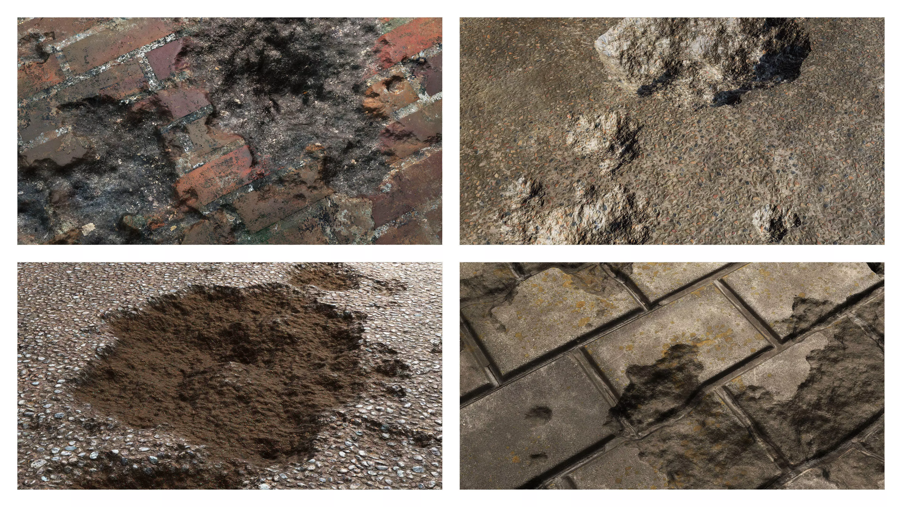Keywords: damaged surface texture set, 8k pbr textures, cracked concrete texture, damaged asphalt material, eroded brick wall pbr, weathered surfaces, tileable damaged textures, game-ready pbr pack, high resolution environment materials, photorealistic damage textures, destruction environment assets