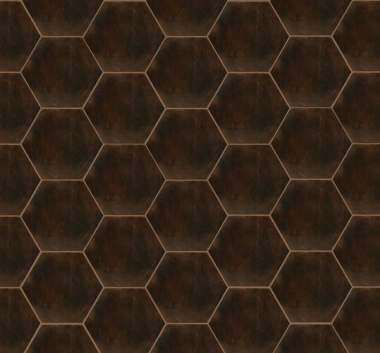 Seamless hexagonal tile material in deep espresso brown with subtle marbling and soft grout bevels for realistic edge definition.