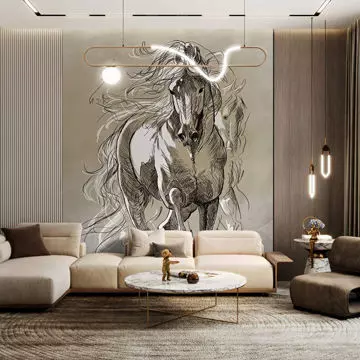 What’s includedDynamic hand‑drawn horse in motion with flowing mane and expressive hatching over a soft gradient ground shifting from warm taupe to cool grey, supplied as a seamless high‑resolution mural texture .