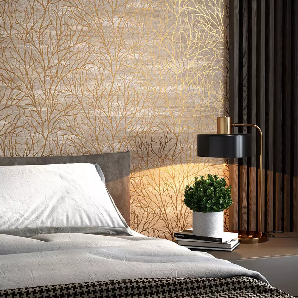 OverviewA serene, contemporary wallpaper texture featuring flowing metallic‑gold tree branches over a warm linen ground. Subtle horizontal weave and raised gilded lines add tactile depth, creating a soft glow that elevates bedrooms, lounges, hotel suites, and spa interiors. The seamless repeat ensures continuous branches without visible joins on large feature walls.