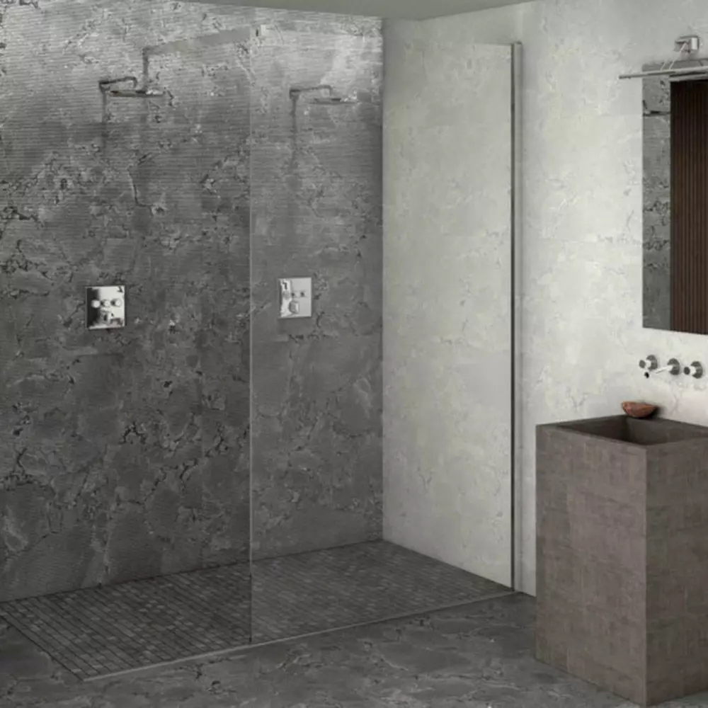 A deep charcoal marble shot through with pale mineral veining is overlaid with fine vertical ribbing, creating a tactile, light‑responsive surface ideal for showers, baths, and upscale hospitality interiors . The subtle striation adds grip and visual interest while preserving the natural drama of the stone, pairing effortlessly with stainless fixtures and concrete basins . Artwork is optimized for seamless large‑format tiling and CGI staging, with crisp vein continuity across panels as shown in the double‑shower installation .