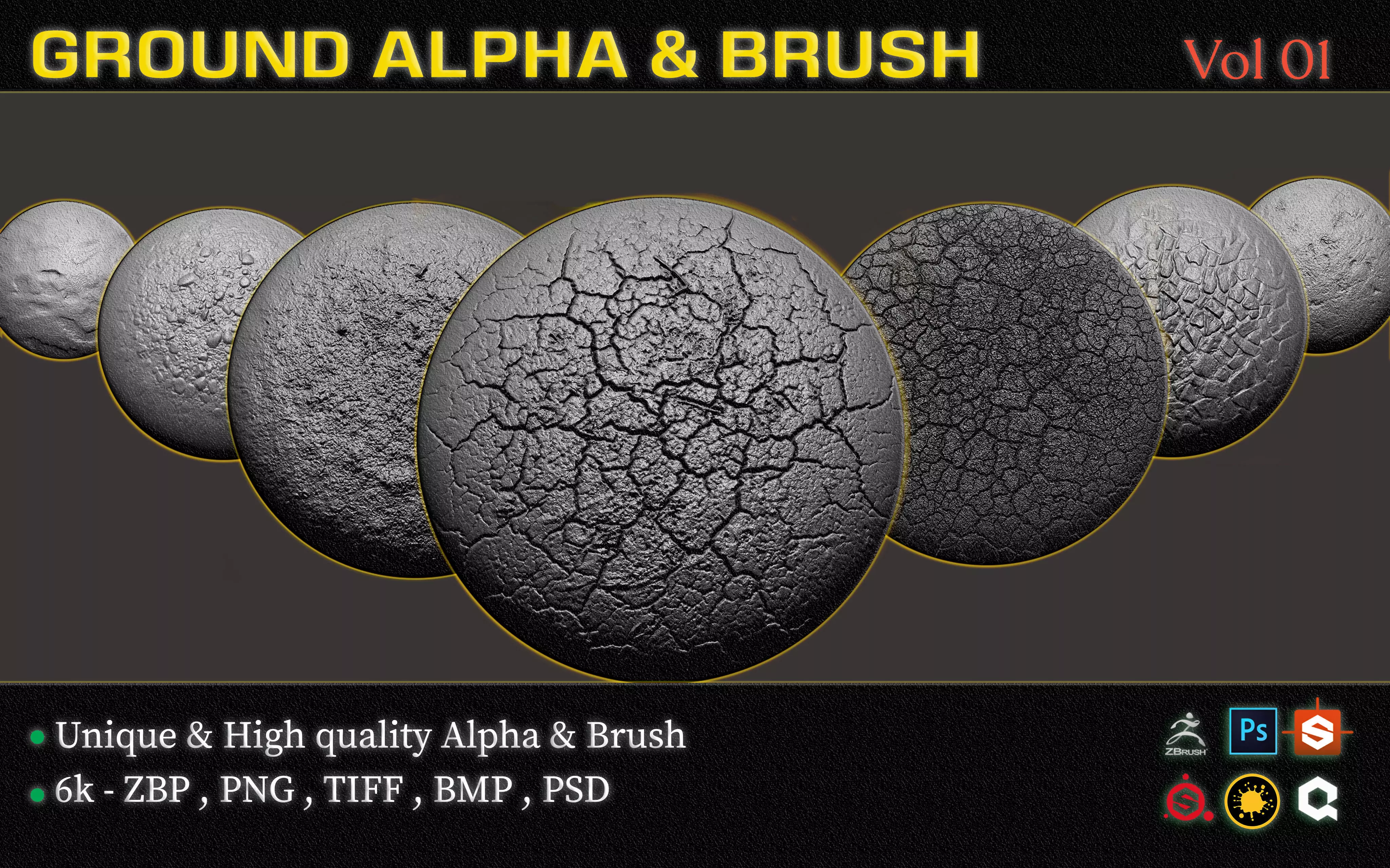 Pack contains 30 alphas maps (PNG, PSD, Tiff, BMP, 6K resolution) to add ground details to your mesh in Zbrush, Substance Painter and other programs.