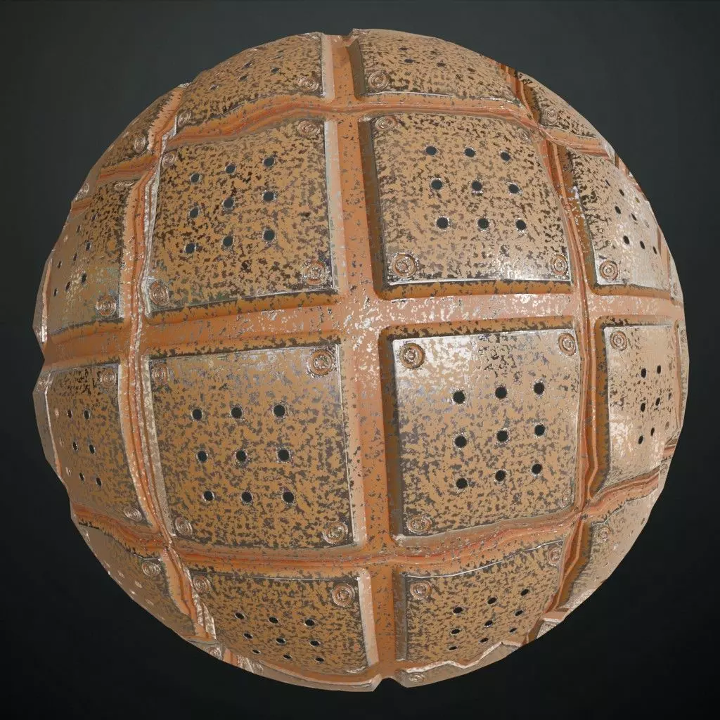 This is a high-quality PBR Texture Pack of a Grunge Sci-Fi Metal Panel Transparent surface.All essential Maps, including BaseColor, Normal, Roughness, Height, Metallic, and Opacity, are provided to deliver a highly realistic and weathered technological finish. This material features a rugged industrial design consisting of square metal panels reinforced with visible rivets and bolt heads. Each panel is heavily perforated with a dense grid of circular holes, allowing for complex light transmission and transparency effects. The metallic surface is characterized by significant grunge elements, including realistic rust patches, oxidized metal textures, and worn orange-tinted paint, making it a perfect choice for aged space stations, derelict industrial machinery, post-apocalyptic environments, or gritty futuristic ventilation systems.