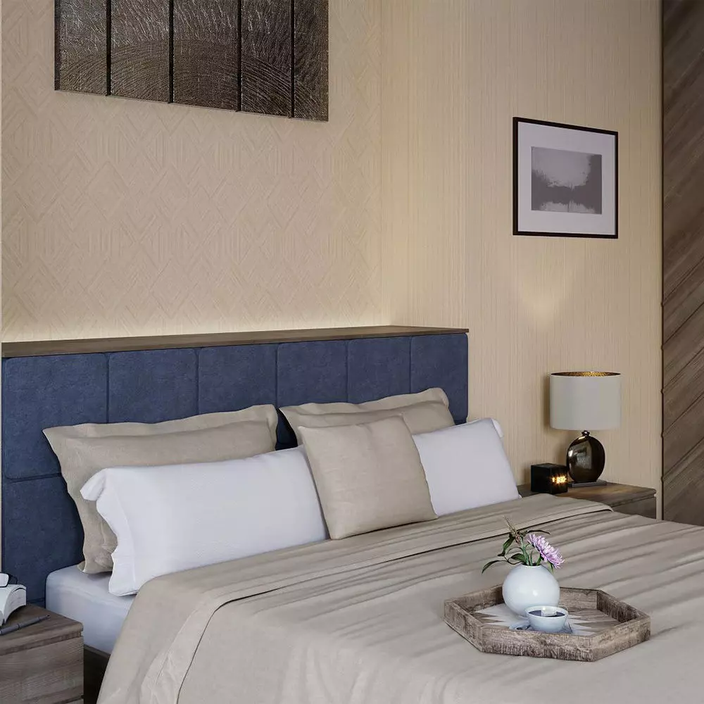 This serene wallpaper features a fine herringbone weave rendered in warm ivory, creating a quiet, tactile backdrop that brings hotel‑suite calm to bedrooms and lifestyle visuals. The surface mixes micro‑ribs and soft cross‑threads that catch light gently, adding dimension without glare so bedding, art, and lighting remain the focus in close‑ups and wide shots. Included are two high‑resolution JPGs: a styled bedroom scene with upholstered headboard and soft ambient cove light for realistic scale and palette pairing, plus a crisp macro showing the woven chevron texture for tight crops and swatch boards. Use the macro for packaging callouts or overlay textures, and use the room image as an instant hero background for linens, nightstands, and décor product staging with generous negative space for typography. The ivory‑neutral palette grades smoothly—adjust warmth, contrast, or tint to align with brand guidelines while preserving highlight detail along the weave for web and print. Ideal for CGTrader previews, catalog covers, Pinterest creatives, and archviz plates where minimal, restful sophistication is required. Delivered as high‑quality JPGs optimized for cropping to square, 4:5, or 16:9 layouts across platforms and ads.