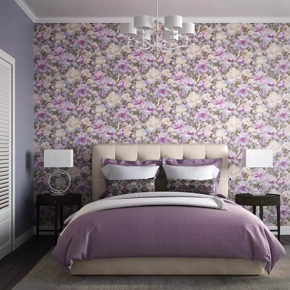 What’s includedSeamless wallpaper featuring painterly lilies and leaves in lilac, cream, and olive on a misty violet ground for calm romantic interiors.