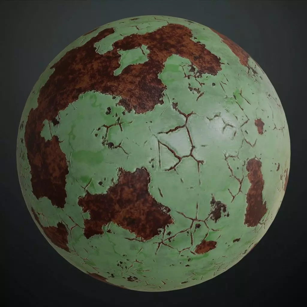 This is a high-quality PBR Texture Pack of a Machine Chipped Paint surface. All essential Maps, including BaseColor, Normal, Roughness, Height, and Metallic, are provided to deliver a highly realistic and weathered industrial finish. This material features a thick, pale green industrial coating that has undergone significant environmental stress. The surface is characterized by large, irregular areas of chipped paint revealing a dark, oxidized metal substrate underneath, complete with intricate cracking and surface grime. This texture is an ideal choice for heavy industrial machinery, aged factory equipment, weathered shipping containers, or derelict urban environment assets where a high degree of urban decay and realistic wear is required.