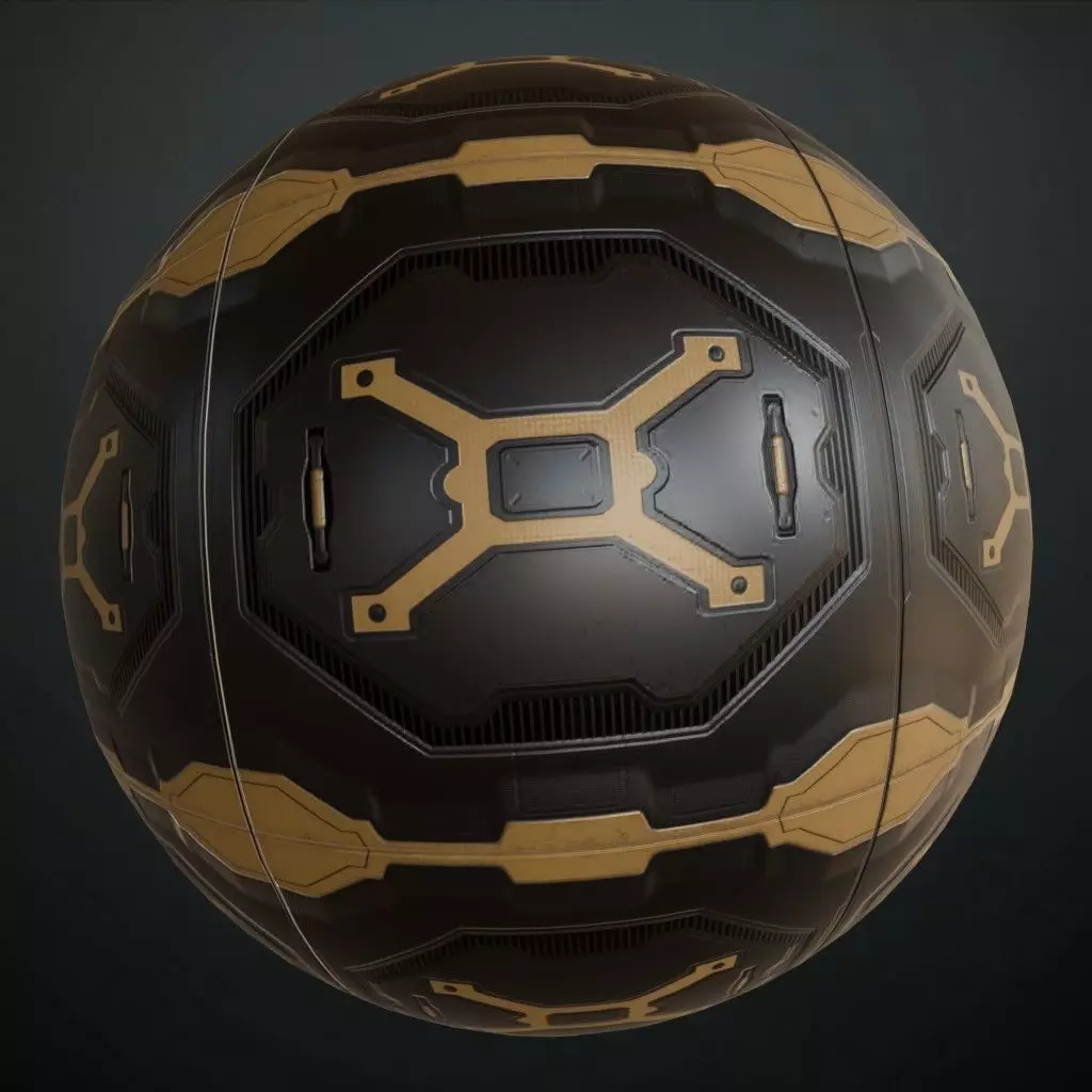 This is a high-quality PBR Texture Pack of a Metal Plate surface. All essential Maps, including BaseColor, Normal, Roughness, Height, and Metallic, are provided to deliver a highly realistic and technologically advanced industrial finish. This material features a sophisticated sci-fi panel design, consisting of a central dark metallic octagonal plate framed by reinforced golden-tan structural supports. The plate is integrated with vertical cooling vents and precision-engineered mechanical indentations, while the gold accents feature subtle industrial wear and tonal variations. This texture is an exceptional choice for futuristic bulkheads, high-tech command consoles, starship hull plating, or specialized environmental assets in premium science fiction settings.