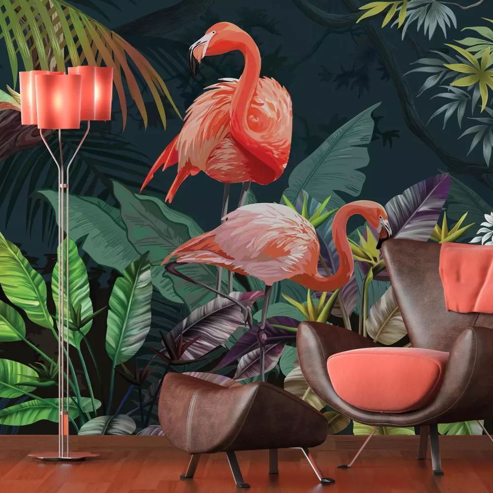 What’s includedStatement mural featuring two vivid coral flamingos amidst lush tropical foliage painted in layered greens and purples on a deep teal night backdrop, delivered as a seamless high‑resolution texture for full walls and close‑ups.