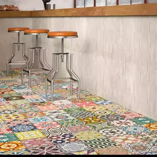 A lively mosaic of Moroccan‑style and Mediterranean encaustic motifs arranged in a patchwork grid brings artisanal warmth to floors and walls in cafes, kitchens, foyers, and retail spaces . The palette blends saffron, teal, coral, olive, and indigo with soft neutrals, delivering a handcrafted look that reads vibrant from afar yet detailed up close . Artwork is prepared for seamless tiling over large areas with crisp edges and light paper‑plaster texture for convincing ceramic realism in print or CGI visualizations, as shown in the lifestyle bar floor preview .