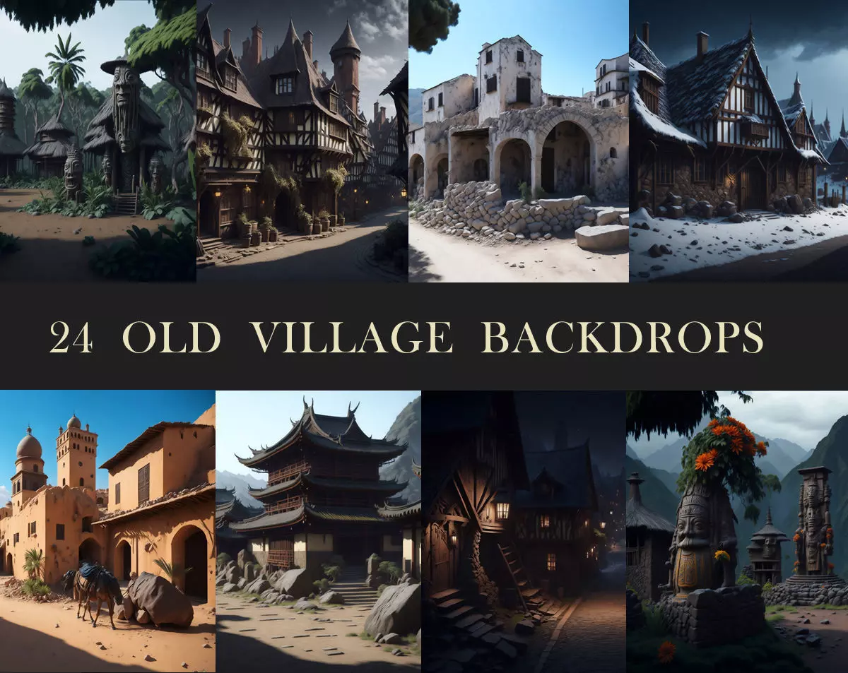 Collection of 24 4k resolution Old Village themed digital backdrop images, suitable for over-rendering, photo compositing, splash screens or other digital editing. This is not a collection of 3D scenes.