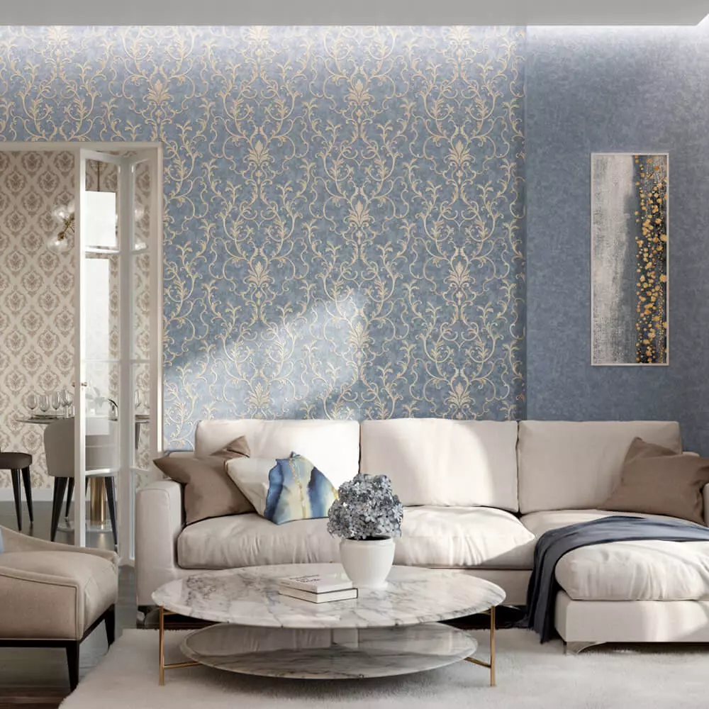 OverviewAn elegant baroque damask wallpaper texture featuring sculpted champagne scrolls and leaf motifs over a soft powder‑blue ground. Fine ribbed highlights, stippled infill, and a subtle textile base lend rich depth while keeping the palette calm for living rooms, bedrooms, boutique hotels, and classic foyers. The seamless repeat ensures continuous ornament across large feature walls.