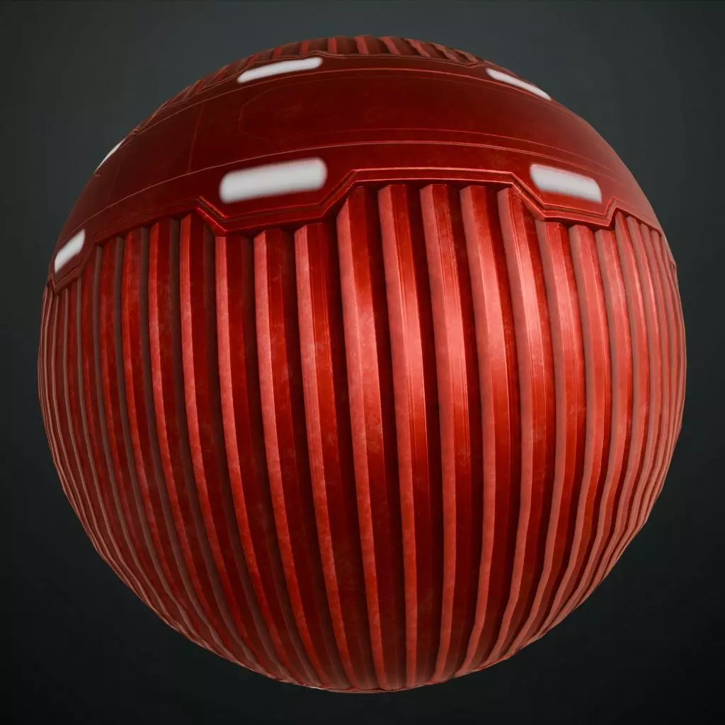 This is a PBR Texture Pack of Red Sci-Fi Metal Panel. The material features a sophisticated futuristic design with bold vertical ribbing and integrated glowing light strips, perfect for starship corridors, high-tech engine rooms, or futuristic server bays. All essential maps, including BaseColor, Normal, Roughness, Height, Metallic, and Opacity, are provided to ensure high-fidelity realism and accurate light interaction in your 3D scenes.