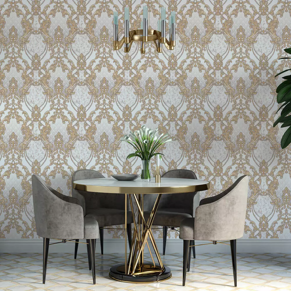 Elevate luxury interiors with a seamless rococo wallpaper featuring ornate gold scrollwork and cameo medallions set over a soft pearl‑grey damask ground for rich depth and sheen. The repeat is tuned for clean UV tiling, reading opulent in wide dining shots while preserving crisp emboss and metallic sparkle in close‑ups for hospitality and residential scenes. The pack includes a 4K seamless tile (PNG/JPG), optional PBR maps to accent relief and gilded highlights, a high‑res detail crop, and a styled dining‑set mockup ideal for thumbnails and client decks. Neutral champagne and grey tones grade easily across Cycles, V‑Ray, Corona, Octane, and Unreal, enabling fast look‑dev from classic palace to modern glam settings. Licensed for commercial use in renders and composites; redistribution or resale of the raw texture file is not permitted.