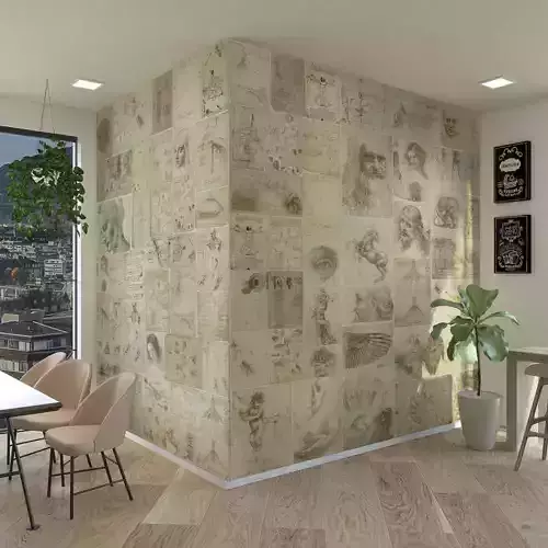 What’s includedA seamless collage of aged sketchbook pages featuring anatomical studies, machines, flying wings, and handwritten notes in warm parchment tones, supplied as a high‑resolution texture for full walls and close‑ups.