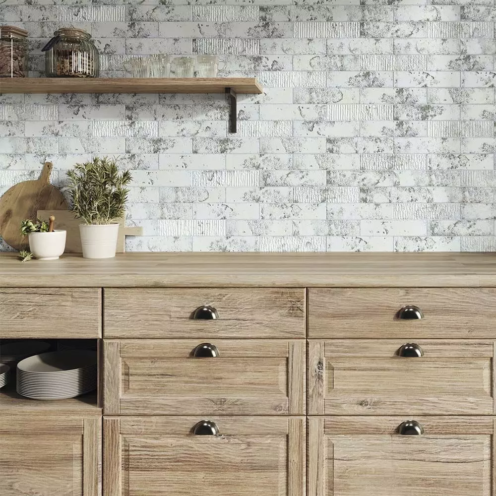 Authentic Rustic Finish: Features subtle wear and variation, realistic grout lines, and tactile surface texture to emulate hand-laid, lightly distressed whitewashed brick.