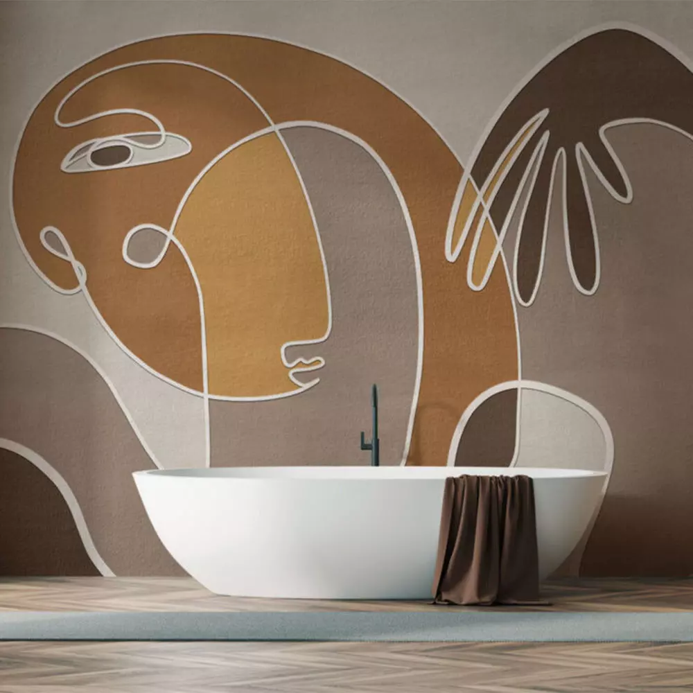 A calming abstract portrait drawn in a single flowing line with an elegant arch and hand motif, layered over soft plaster‑like textures for a refined, gallery feel in living rooms, bedrooms, spas, and boutique hotels . The composition balances negative space with generous curved forms so the mural reads beautifully from near and far without overpowering furniture or decor . Delivered in curated palettes—warm beige/caramel, mineral sage/olive, and clean outline on white—each version preserves crisp vector‑style edges and subtle grain for premium large‑format printing and CGI staging . Lifestyle preview demonstrates true‑to‑scale proportioning for feature walls and panel tiling in contemporary interiors .